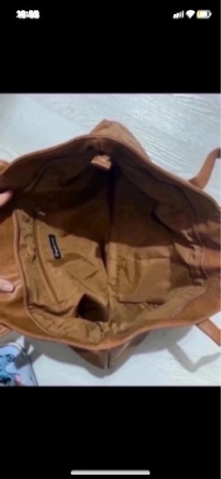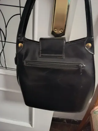 Bolso de mano de piel sintética en color marrón. Lo único que tiene mal son un poco las esquinas como se ven en las fotos. Le falta el tirador de la cremallera, pero cierra bien