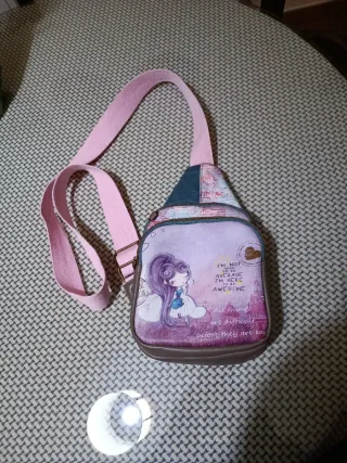 Bolso bandolera con un bonito diseño de niña. - Estampado frontal con dibujo de niña y texto. - Correa ajustable de color rosa. - Cierre de cremallera. Precio negociable