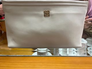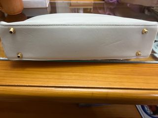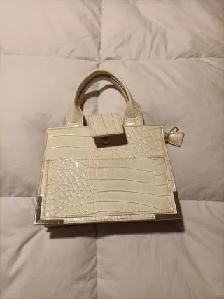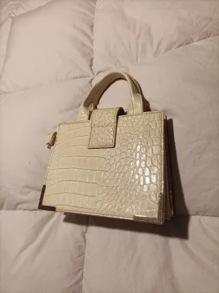 Elegante bolso de mano en tono beige, perfecto para complementar tu estilo. - Diseño moderno y minimalista. - Acabado suave al tacto. - Detalle metálico dorado en la parte frontal.