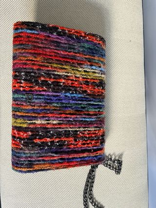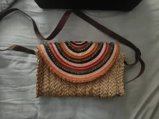 Bolso de mano con un diseño tejido y llamativo multicolor con un acabado brillante. Presenta un detalle de corazón en la parte frontal. - Silueta en forma de media luna. - Asa trenzada. - Acabados en charol negro. - Cierre de cremallera, con varios bolsillos interiores, dos de ellos con cremallera. El diseño presenta un patrón de cuadros trenzados en una variedad de colores vibrantes y metálicos, incluyendo tonos de azul, rojo, amarillo, morado y negro. Recoger en zona de Congosto en Villa de Vallecas. Hago envíos.