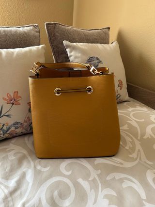 Bolso de mano de color mostaza con un diseño elegante y moderno.
