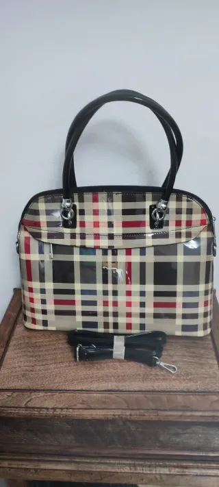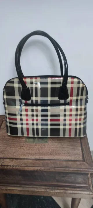 Elegante bolso de mano con un llamativo estampado de cuadros. - Diseño tipo bowling. - Asa de mano y correa para hombro. - Acabado brillante.