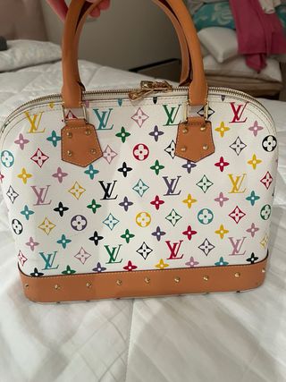 Bolso grande de mano , color blanco , multicolor con estampado de letras y flores en varios colores sobre fondo blanco. - Diseño icónico. - Asas de piel. - Base reforzada con tachuelas.