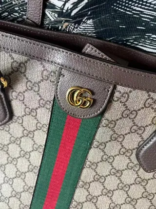 Elegante bolso tote de Gucci con el icónico estampado GG Supreme. - Combinación de colores beige y marrón. - Raya verde y roja distintiva en el centro. - Asa de cuero marrón. - Detalle de logo GG dorado.