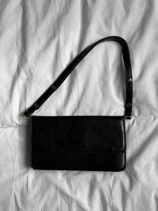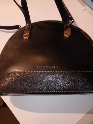 Elegante bolso de piel de la marca ANDREA. Usado. Muy bien estado. Lo entrego en mano. - Material: Piel. - Color: Negro. - Diseño: Forma de media luna con asa corta y correa larga. - Detalle: Costuras blancas y apliques dorados.