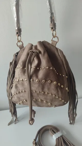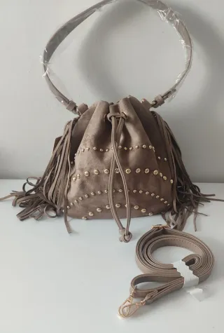 Bolso estilo bombonera con flecos y tachuelas doradas. - Material tipo ante. -Medidas 32×22 cm, base 12 cm. - Cierre de cordón. - Incluye dos correas, una más corta y otra larga ajustable