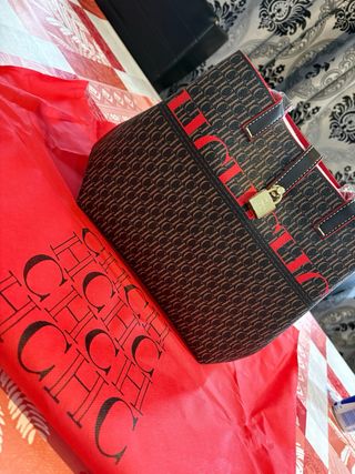 Elegante bolso de mano con el distintivo monograma de la marca. - Diseño bicolor en marrón y rojo. - Cierre con candado dorado. - Incluye bolsa guardapolvo.