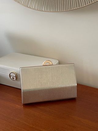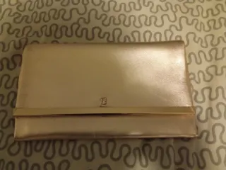 Elegante bolso de mano para eventos especiales. - Diseño rígido tipo clutch. - Acabado texturizado en tono champán. - Cadena metálica dorada para llevar al hombro.