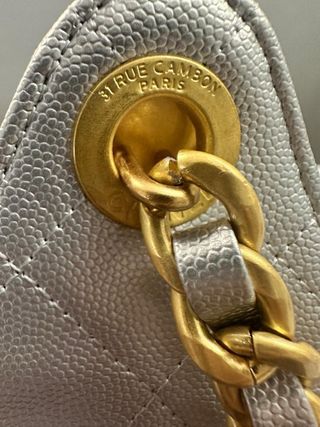 Elegante bolso de mano con diseño acolchado. - Color gris metalizado. - Cadena dorada. - Cierre de cordón. - Logo de la marca en la parte frontal. Escribeme para detalles y mejor precio!