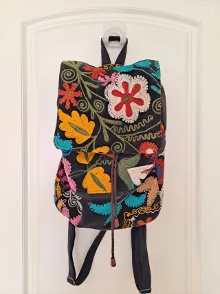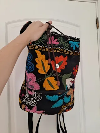 Mochila bordada a mano comprada en Turquía hace 10 años pero sin usar. De color negro de un aterial parecido al ante o terciopelo y con flores bordadas a mano en diferentes colores. Gran capidad, con cierre de cuerda y tres compartimentos con cremalleras. Medidas en las fotos. Puedo entregar en mano en Madrid, por si la quieres ver en persona. - Bordado floral multicolor. - Cierre de cordón ajustable. - Correas de hombro acolchadas.