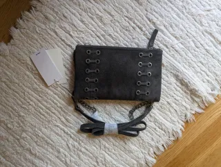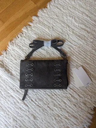 Bolso de mano o bandolera de Mango. - Material: Ante. - Color: Gris. - Cierre de cremallera. - Detalle de ojales y cordones. - Incluye correa de cadena. - Con etiquetas.