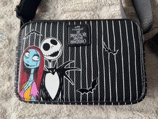 Bolso de mano con diseño de Jack y Sally de Pesadilla antes de Navidad. - Estampado a rayas blancas y negras. - Ilustraciones de Jack Skellington y Sally. - Incluye etiqueta. Recoger en zona de Congosto en Villa de Vallecas. Hago envíos.