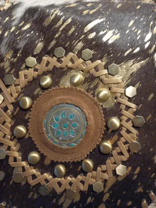 Bolso de piel de vaca con un diseño único y llamativo. - Material: Piel de vaca. - Adornos: Tachuelas metálicas y detalles en dorado. - Estilo: Bohemio y artesanal.
