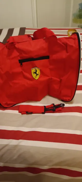 Bolsa de deporte con el logo de Ferrari. Bolsa plegable que queda reducida para que no ocupe cuando se guarde. Muy practica - Color rojo vibrante. - Detalle del escudo de Ferrari. - Asa de mano. - Compartimento con cremallera frontal.