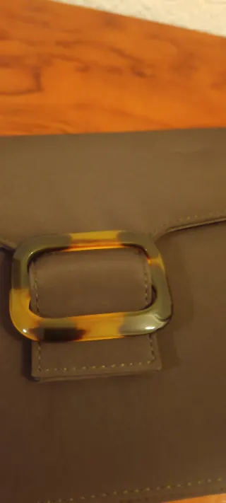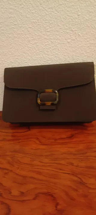 Elegante bolso cartera de color marrón, con un diseño moderno y un cierre distintivo. Con correa para llevarlo colgado. Con tres compartimientos interiores, uno de ellos con cremallera. Mide 29x19 - Hebilla frontal con acabado tipo carey. - Diseño tipo sobre con solapa. - Material de acabado mate.