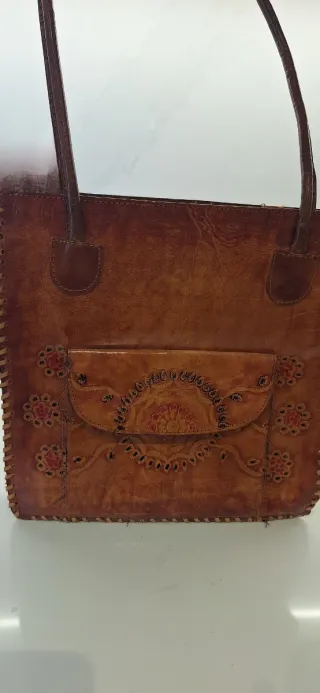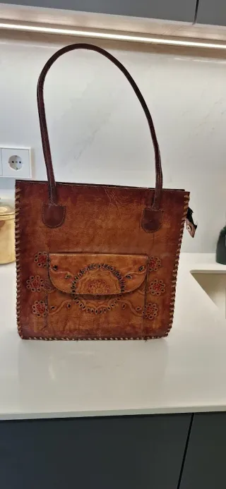Bolso de piel de estilo marroquí con detalles decorativos. - Elaborado en piel de alta calidad. - Diseño con adornos florales y detalles en relieve. - Costuras visibles en los bordes.