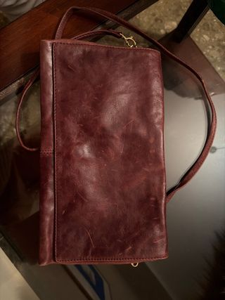Elegante bolso de mano en cuero de color burdeos. Presenta un diseño sofisticado con detalles trenzados y herrajes dorados. - Cierre principal con cremallera. - Bolsillo frontal con hebilla decorativa. - Asas cómodas para llevar al hombro. - Cremalleras laterales decorativas.