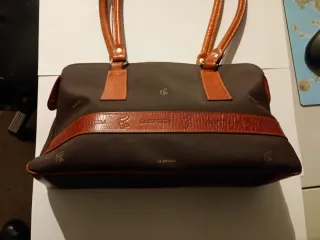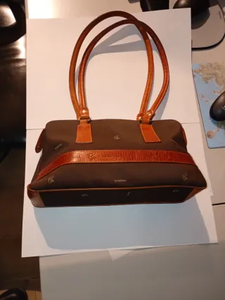 Elegante bolso de la marca La Espuela, de Ubrique. Con un diseño sofisticado. Usado. Buen Estado.. - Combinación de piel y tela. - Color marrón. - Asas cómodas para llevar al hombro.