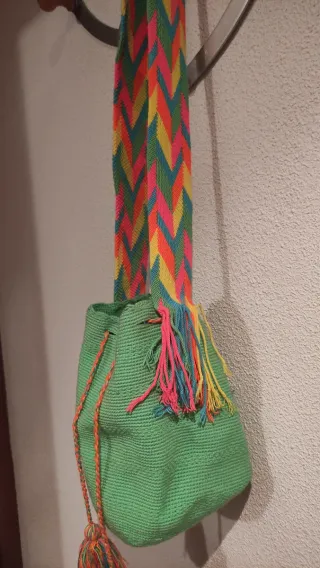 Bolso artesanal tejido a mano, un accesorio único con un diseño vibrante. - Tejido a mano. - Tiras y pompones de colores. - Cierre de cordón. - Comprado en Colombia. Hecho a mano - Nuevo, sin estrenar #guayu #wayuu #bolso #colorrs #colombia #handmade #artesanal