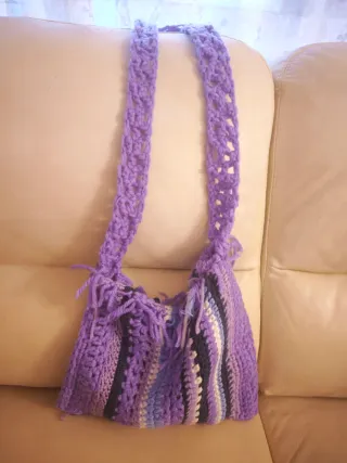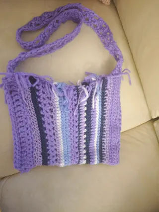 Bolso bandolera tejido a mano con un diseño de rayas en diferentes tonos de morado y azul. - Asa larga y ajustable. - Acabado con flecos en la parte superior.
