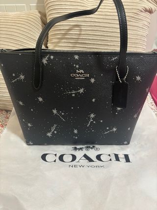 Bolso de mano Coach con un diseño de estrellas plateadas sobre fondo negro. - Estampado de constelaciones y estrellas. - Cierre de cremallera. - Incluye etiqueta colgante. - Viene con bolsa guardapolvo.