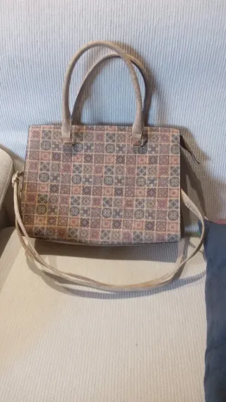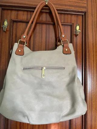 Bolso de mano con un diseño elegante y moderno. - Combinación de colores beige y marrón. - Ribetes y detalles en piel. - Correa ajustable para llevar al hombro.