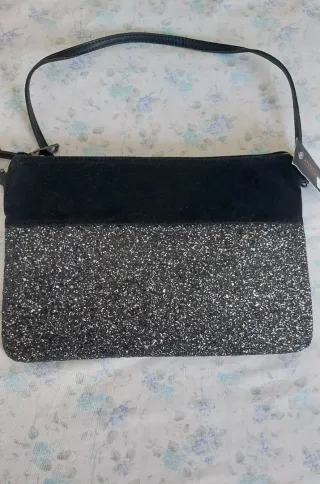 Bolso pequeño (27X20cm) con correa que engancha con mosquetones, se puede quitar y llevar como cartera de mano. Parte superior en ante negro. Parte inferior con purpurina plateada. Cierre de cremallera.
