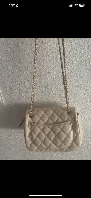 Bolso de mano estilo bandolera en color camel. Cierre con broche metálico dorado. La cadena es dorada y larga aunque se puede poner el bolso corto dándole una vuelta por dentro. Una de las argollas está cambiada como se puede ver en las fotos. Springfield