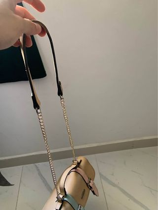 Bolso de mano con un diseño moderno y elegante. - Combinación de colores beige y rosa. - Correa de cadena metálica. - Detalles de hebillas.