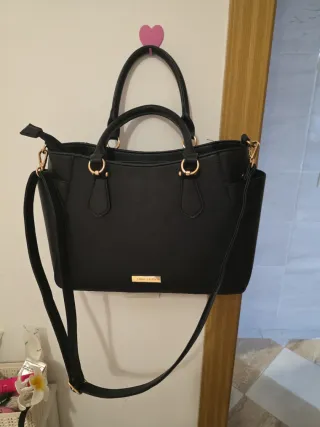 Bolso de mano negro de Primark con detalles dorados. - Cierre de cremallera. - Dos asas cortas. - Bolsillo exterior con cremallera. REBAJADO
