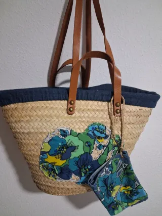 Bolso de paja tejido a mano, con un diseño único y original. - Adornado con apliques de tela con estampado floral. - Forro interior de tela vaquera, reversible. - Asas de cuero. - Incluye un pequeño monedero a juego hecho a mano también