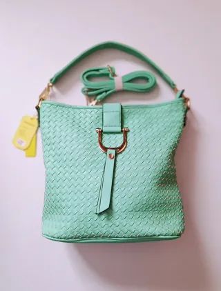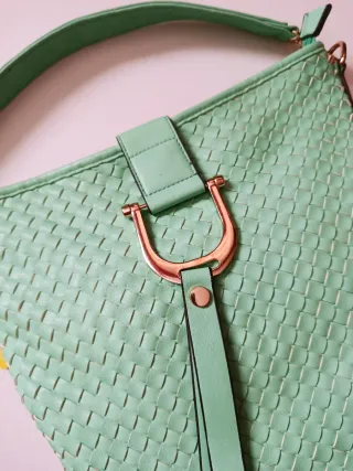 Bolso MF de color verde pistacho, un accesorio llamativo y duradero. - Diseño con textura de cuadros. - Asa de mano y correa ajustable. - Cierres metálicos dorados.