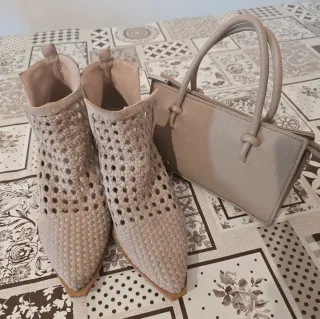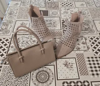 Conjunto de botines y bolso a juego. - Botines de estilo abierto con detalle de tejido. - Bolso de mano con cierre de cremallera y asas anudadas.