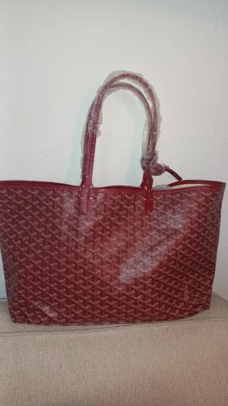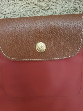 Bolso de mano con un diseño elegante y práctico. - Color granate. - Medidas aproximadas de 40x48 cm. - Asas de cuero marrón. - Cierre con botón a presión y solapa.