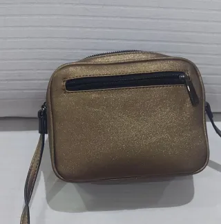 Bolso de mano con un acabado metálico brillante. Su diseño compacto lo hace ideal para llevar lo esencial. - Doble compartimento principal con cremallera. - Correa ajustable para llevar al hombro o cruzado. - Detalle de asa corta en un lateral.