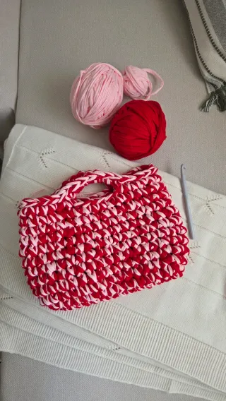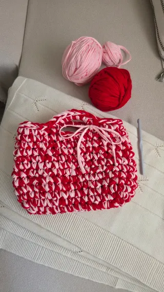 Bolso de trapillo tejido a mano por mi, con tela rosa y roja. Acepto ofertas Hago envíos