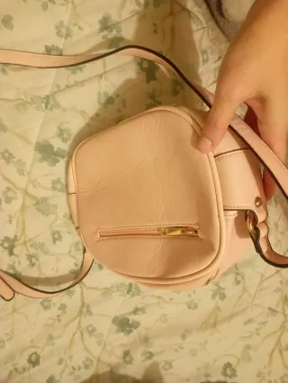 Bolso de mano de color rosa con asas de cuero. - Compartimento principal con cierre de cremallera. - Bolsillo exterior con cremallera. - Pequeño bolsillo frontal. - Placa decorativa en la parte frontal.