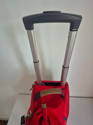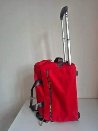 Bolsa de viaje o maleta de ruedas de la marca Parfois. Es de nylon, color rojo. Tiene mango desplegable extraíble, dos asas de mano y bandolera ajustable y extraíble, apertura con cremarella. Tiene también varios bolsillos externos y uno interno con cremallera. Está en buen estado salvo la esquina izquierda inferior que tiene un pequeño roto. Se ve en las fotos.
