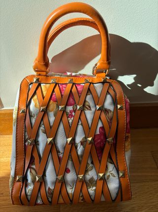 Precioso bolso de mano con un estampado floral vibrante y detalles en naranja. - Diseño con cintas entrelazadas y tachuelas doradas. - Asas superiores de color naranja. - Acabado con borde naranja.