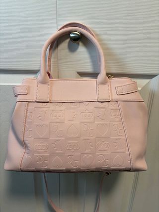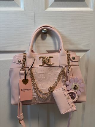 Bolso de mano Juicy Couture en tono rosa, con detalles en dorado. - Diseño con relieve de logos y corazones. - Cadena dorada con perlas. - Incluye un pequeño monedero a juego. - Llavero con forma de flor.
