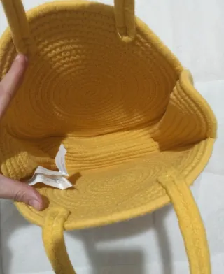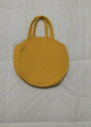Bolso de mano con un diseño circular y asas. - Material de cuerda. - Color amarillo vibrante. - Cierre de cremallera.