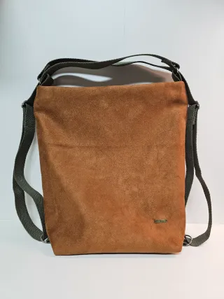 Bolso artesanal tipo bolso de hombro de color marrón avellana efecto Ante, de tacto suave y aterciopelado con asas en verde, que se puede convertir en mochila. - Diseño convertible. - Fabricación artesanal. - Medidas aprox.: 40cm alto x 34cm ancho x 10cm fondo.