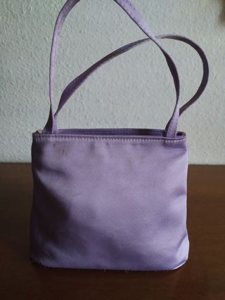 Bolso de raso, pequeño, con asa corta, color lila Alto 14,5 cm Ancho por arriba 15 cm Ancho por la base 17,5 cm Largo de las asas 12 cm.