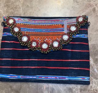 Elegante bolso de mano con un diseño étnico y bordado. - Adornado con abalorios y espejos. - Base de rayas oscuras y rojas. - Detalle de banda tejida con motivos coloridos.