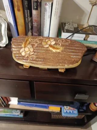 Elegante bolso de mano, perfecto para ocasiones especiales. Su diseño cuadrado y el asa curva le dan un toque sofisticado. - Acabado exterior con pequeñas teselas. - Asa de diseño curvo. - Cierre superior. A recoger el Valdefierro, Zaragoza.