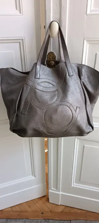 Bolso de mano con un diseño moderno y elegante. - Color plateado metalizado. - Logo de la marca grabado en relieve. - Asas cómodas para llevar al hombro. Medidas 50*30cm Bolso en perfectas condiciones pero tiene dos manchitas de boli. Ver última foto.