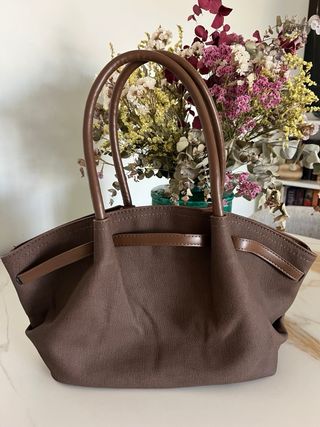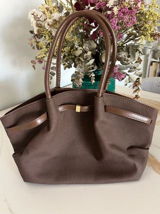Bolso de mano en tono marrón, con un diseño elegante y práctico. - Asas de cuero. - Detalle metálico dorado en la parte frontal. - Material textil resistente. ⚠️Precio no negociable Medidas aproximadas: 25x37cm (asa: 18cm)