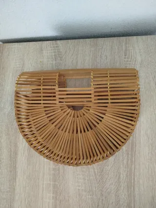 Bolso tipo cesta fabricado en bambú. Su diseño semicircular y las tiras de bambú le dan un toque natural y veraniego. - Material: Bambú. - Diseño: Semicircular con asa superior. - Acabado: Natural.