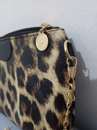 Bolso con un llamativo estampado de leopardo y detalles en negro. 21,5 x 15 Medida asa última foto - Cadena dorada para llevar al hombro o cruzado. - Cierre de cremallera. - Charm metálico decorativo.
