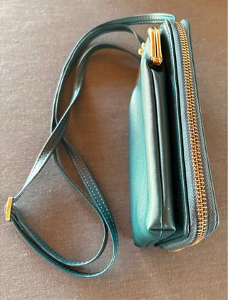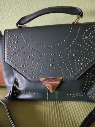 Bolso verde oscuro con detalles dorados marca Misako con asa superior y correa para bandolera. Perfecto estado. Apenas uso. Un pequeñísimo defecto de pérdida de color dorado en el cierre que se puede ver en foto. Medidas 28 x 24 x 6 cm.. tamaño medio perfecto. Puedo enviar